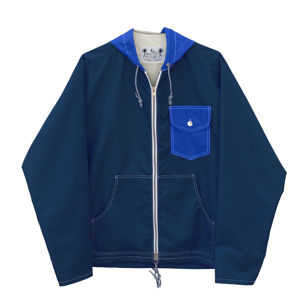 着丈短め、袖丈長め、身幅ゆったりめのクラシックサーフスタイル・フードジャケット。フラップ付きの胸ポケットと大きなパッチポケットが特徴で、後ろにはsurfersネームタグが入っています。