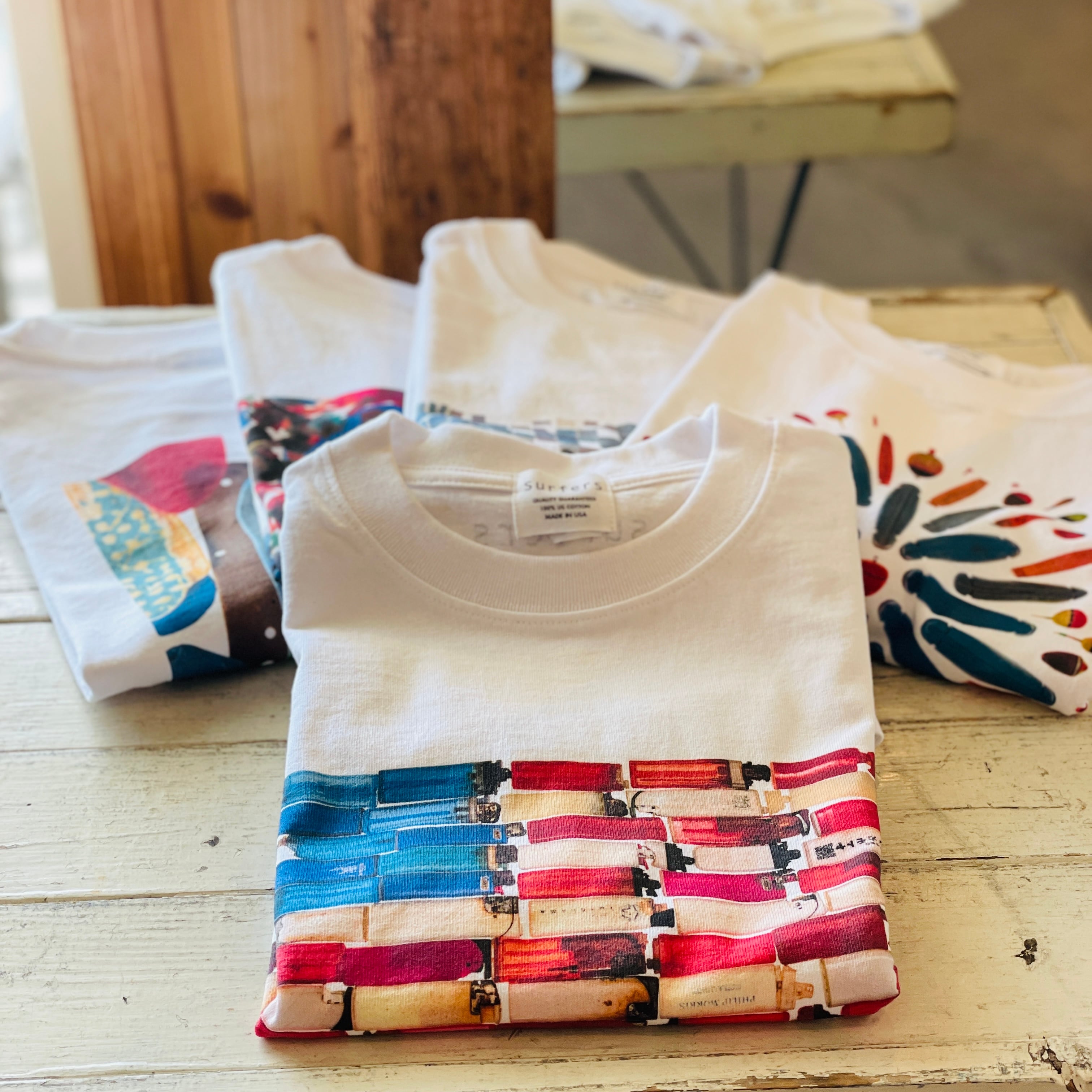 写真家Bruce Osbornが葉山の自宅近くの海辺で収集した漂流物を、素敵な感性でレイアウトして撮影した写真作品をT-SHに。逗子surfersの建物に使われていた古木で作られたウッドキャンバスにプリントした作品も展開。
